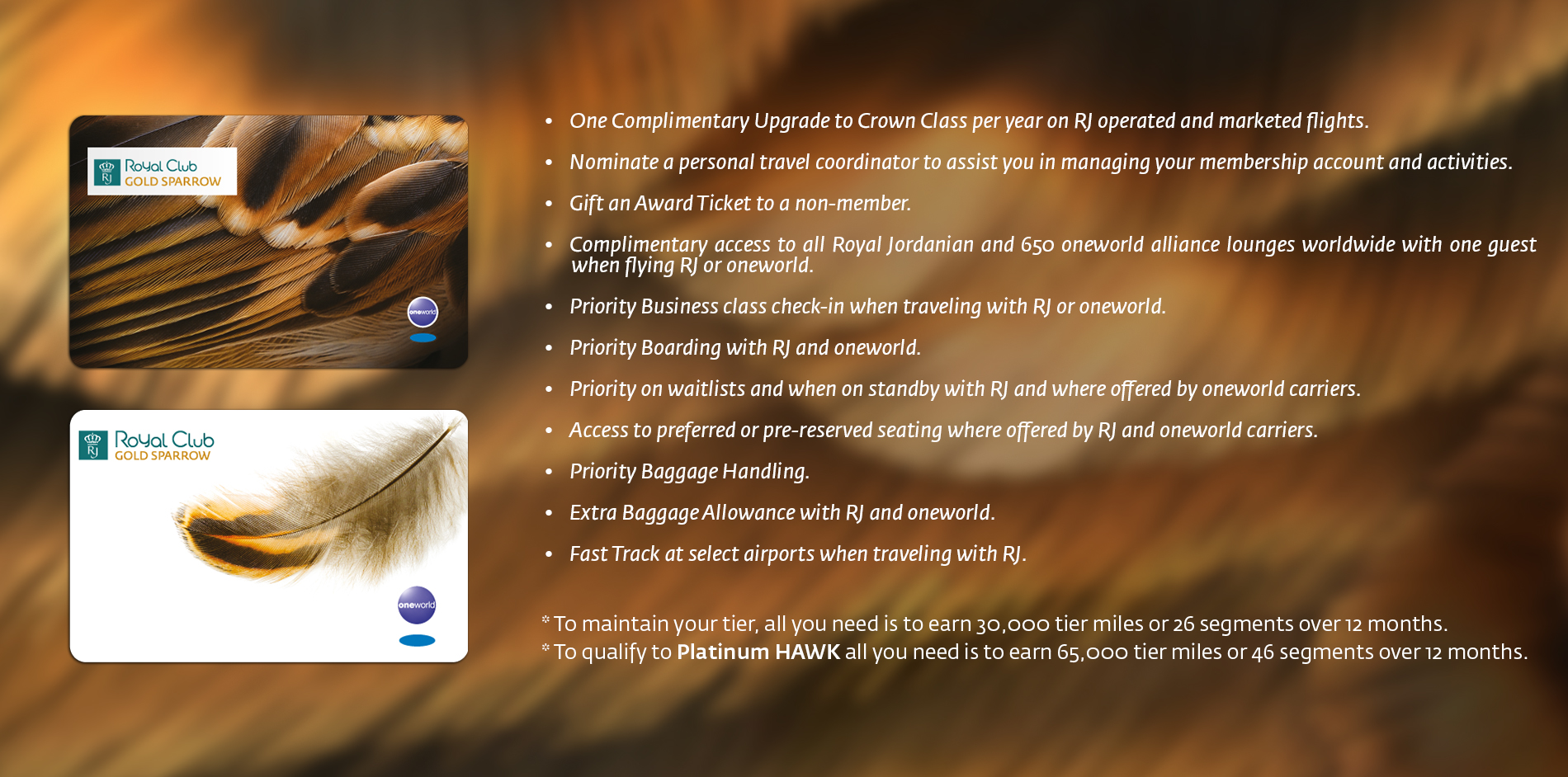 - *Platinum Hawk members are entitled to 2 Complimentary Upgrades every 12 months on RJ operated and marketed flights only.